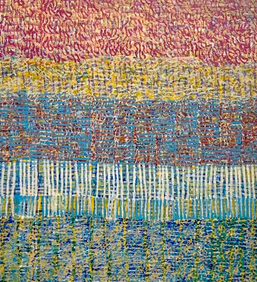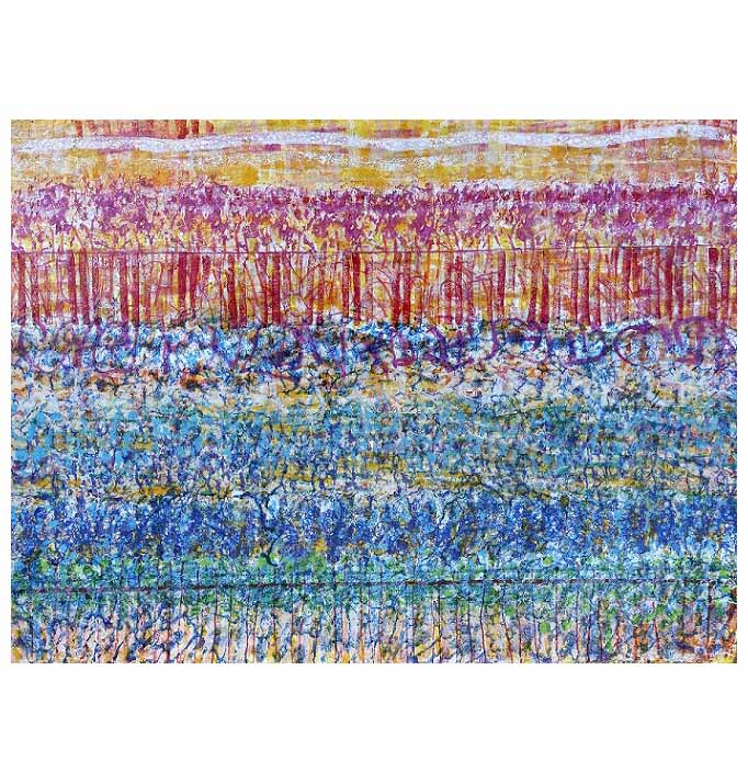 Her painting positions itself in the dichotomy of her two worlds, Scotland and Australia. Place, journeys, metaphorical reference to footprints, pattern with the association to place, memory, moments and people. The dichotomy of the ‘here and there’ the division, separation, repetition, random marks, two equal parts. The ‘here and there’ often described by footprint, shapes, random marks, pattern are mixed with abraded surfaces suggesting rambling connections with these two lands. The subtle fading and broken lines/marks often suggesting the tenuous hold we have on the planet and the fragility of situations and circumstance. Her methodology combines a painterly and mark-making configuration, and with a firm commitment to abstraction she works on surfaces such as canvas, paper, and paper on board. Anne's new environment in Daylesford has inspired an interest in gardens, finding a crossover for Australian and Scottish influences, using light, colour, surface textures, pattern and coded imagery.