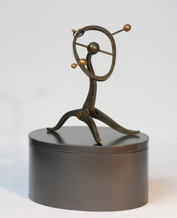 steel, brass, lacquer with cork and mixed media case
