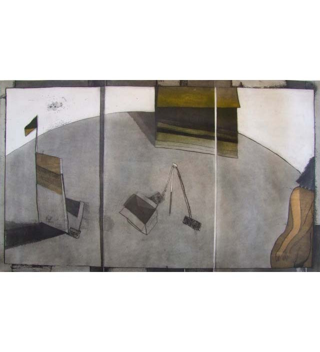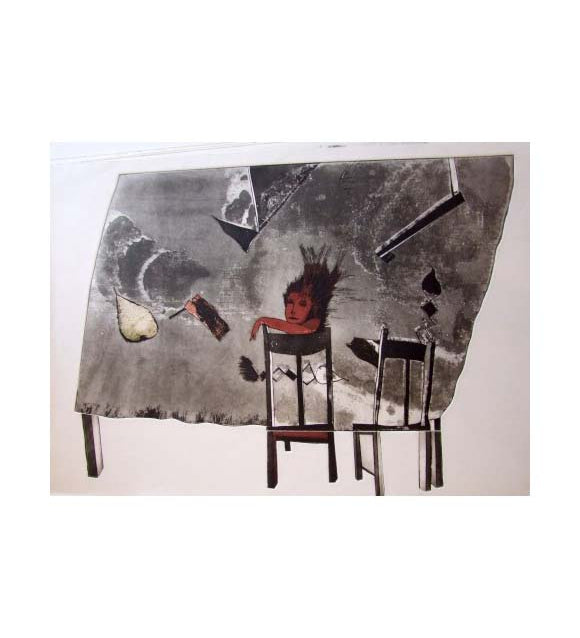 His surrealist inspired works frequently incorporated silver and gold leaf. During the 1970’s Baldessin worked in a studio in the Olderfleet building on Collins St in Melbourne with fellow artists Tate Adams, Les Kossatz, Andrew Sibley, Roger Kemp, Fred Williams and Jan Senbergs.