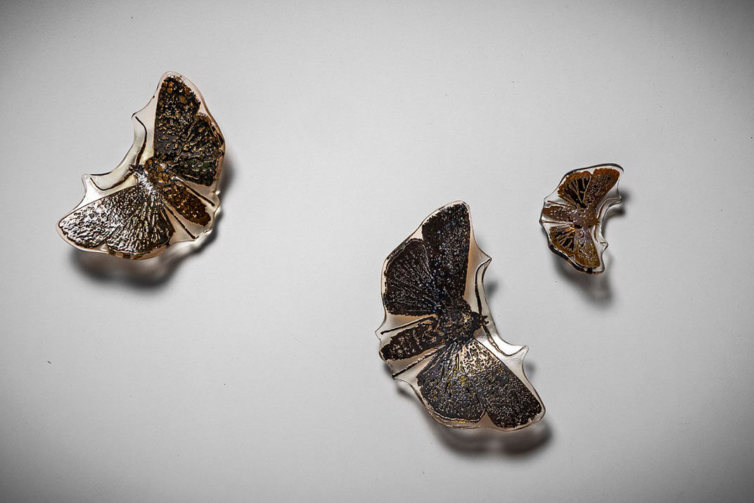 blown glass with glass powder, metal leaf surfaces and gold lustre (3 pieces)