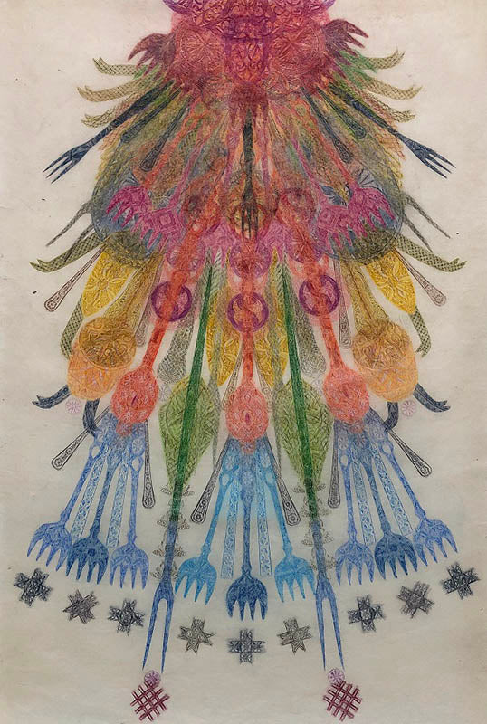pencil on mulberry paper frottage from items in the artist's mother's kitchen, plastic waste and lino
