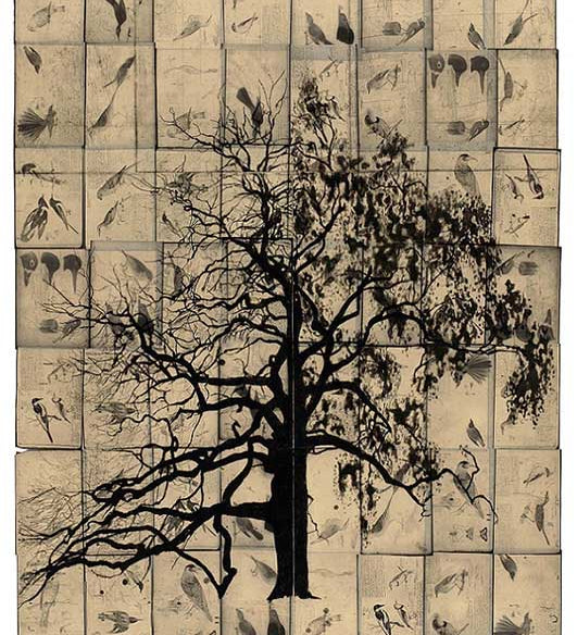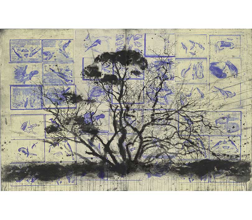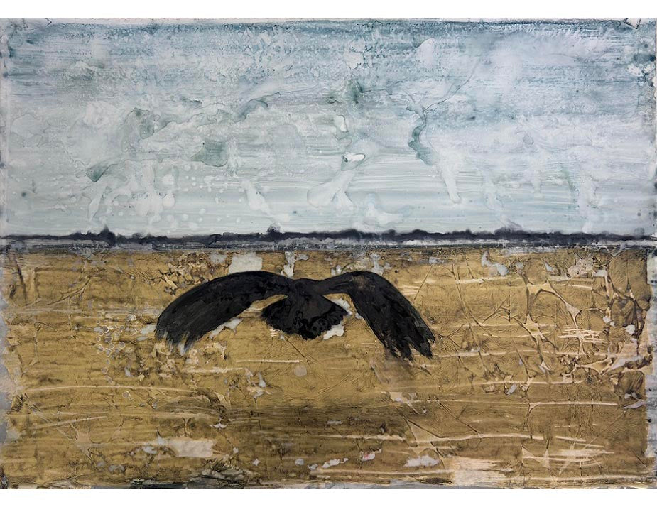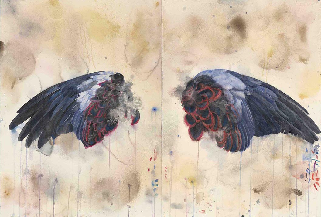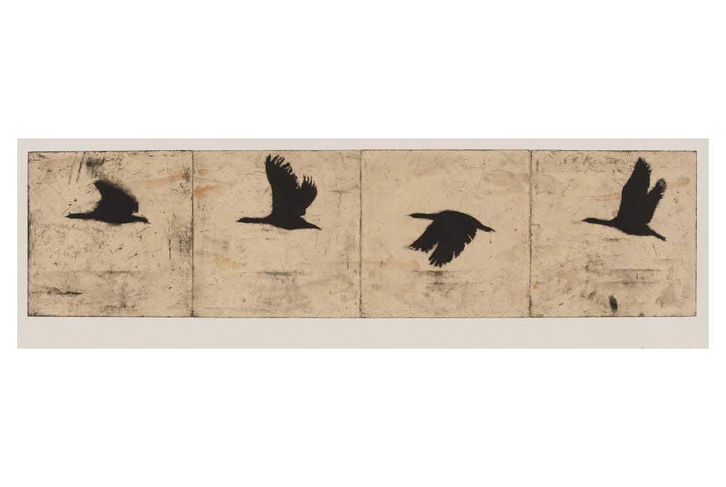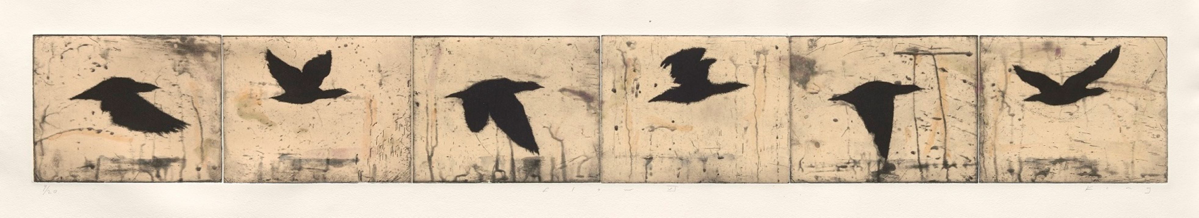 King’s earlier works on paper traced the movement of rain shadows and the effect of weather patterns across undulating terrain and vast tracts of desert. His more recent works express the fragility of our relationship with nature using creatures of the sky as simple motifs that convey a paradoxical vision of the Australian landscape as both tranquil and unsettling.