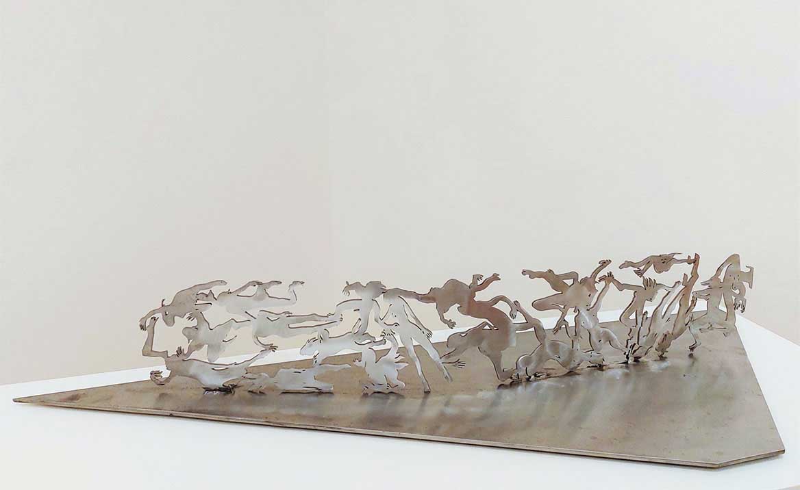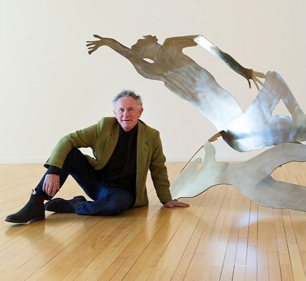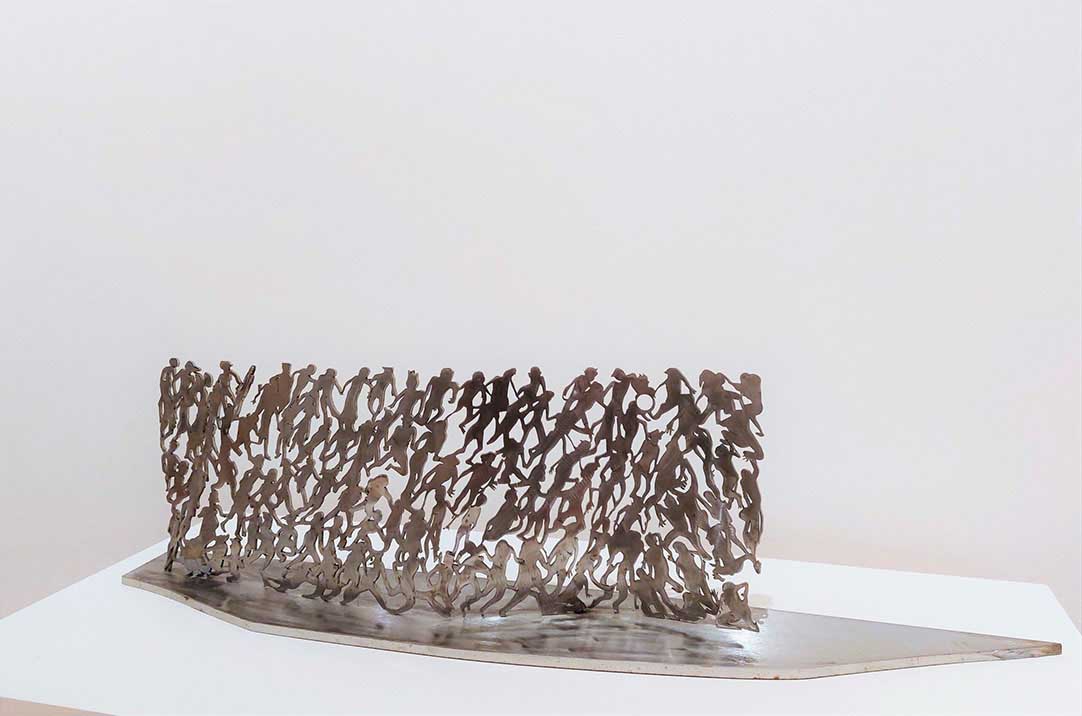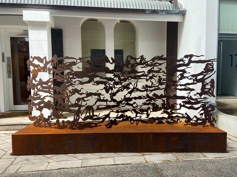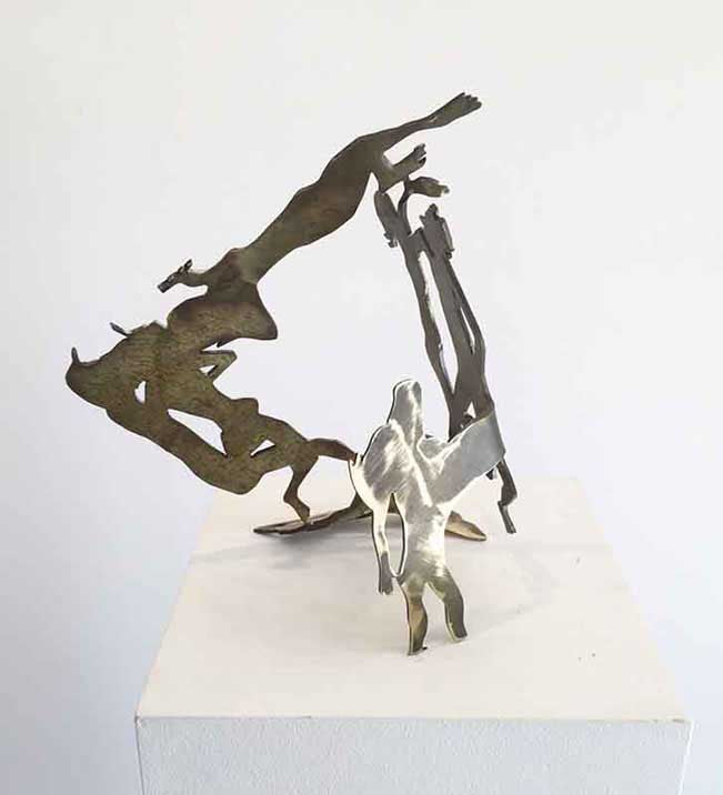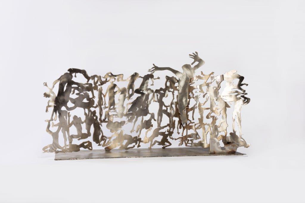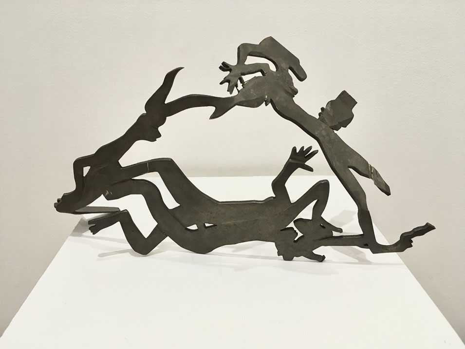 Michael Snape is a sculptor of national significance, who deftly composes structures using combinations of silhouetted human figures. Snape’s continuing fascination with the literal and metaphysical interconnectedness of people resonates poetically through his captivating and masterfully formed steel sculptures, which range from small to considerably large scale. Snape’s works are derived from laser cutting, which is then radically reworked to allow the artist to leave his worked mark. Aesthetically satisfying curves and familiar human forms blend and connect with a rhythmic flow, leading the viewer to find and make connections both visual and conceptual.