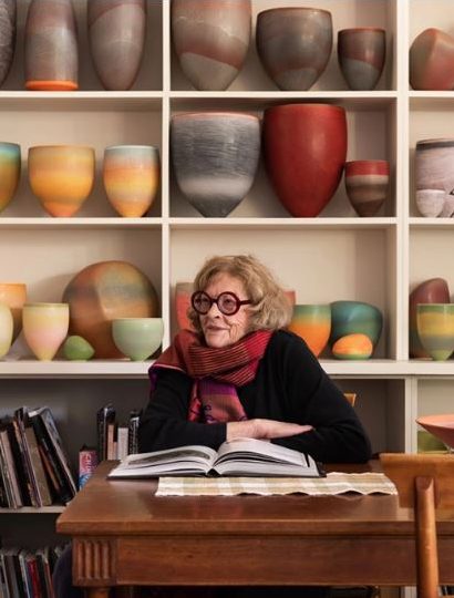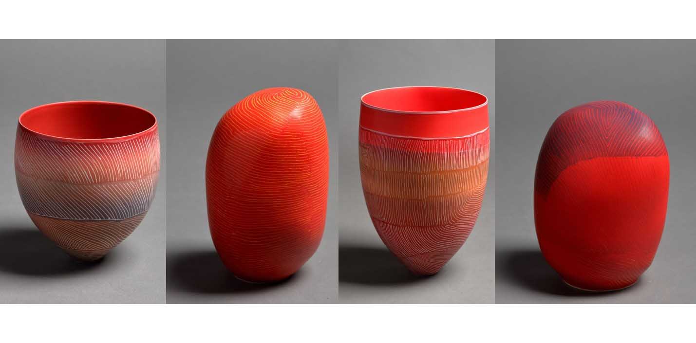 ‘I am inspired by landscape and am driven to capture its essential beauty. My porcelain vessels record my journeys through Australia’s unique and varied environments. The various series trace my travels to the Pinnacles north of Perth, to the Eastern Goldfields and the salt lakes in the interior of Western Australia. A digression to Pakistan resulted in a series of vibrant works inspired by that impressive land and the largest single work I have ever made. Visits to the Tatami Desert saw a more delicately decorated collection and another to the north of the State – the Kimberley and interaction with Aboriginal people is resulting in another series of really strong collections.’ – Pippin Drysdale, 2022
