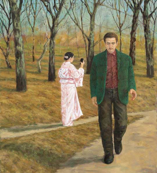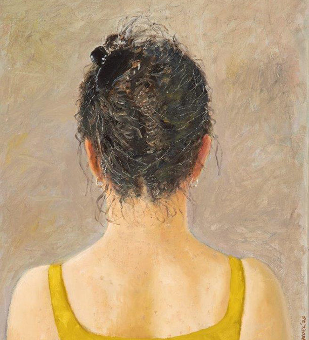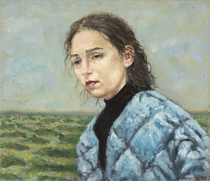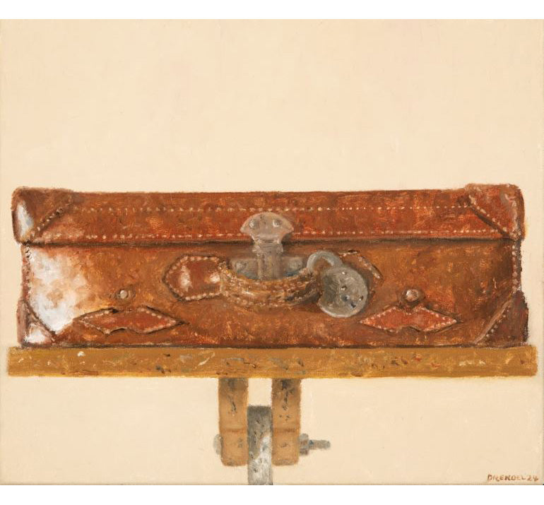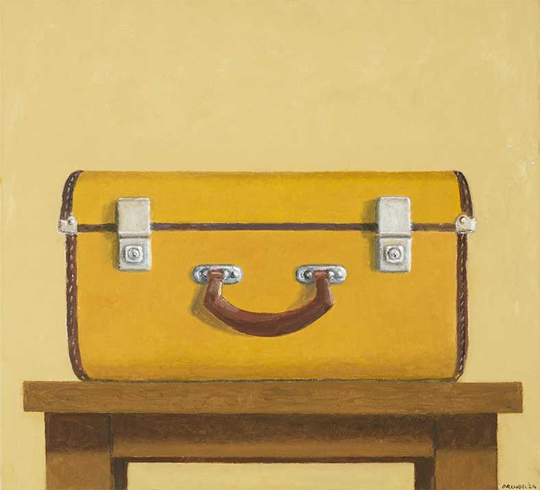 The figures in these works are contemplative, often inward-looking, their placement in the landscape charged with mystery and narrative tension. In some cases, human presence is implied rather than shown, replaced by solitary objects like a suitcase, a water tank, or an upholstered armchair. These paintings feel both familiar and unsettling, humorous and sombre, refined yet open to interpretation.