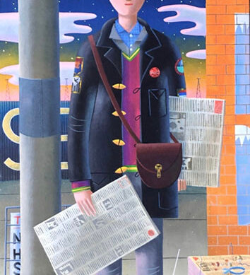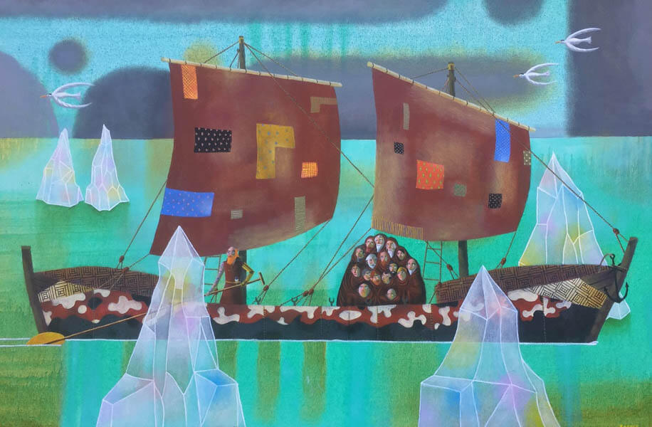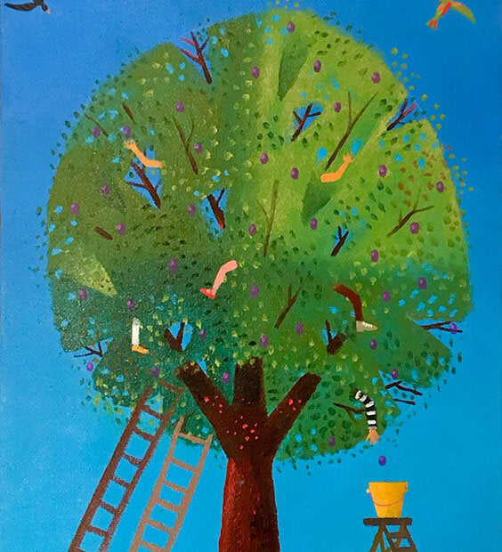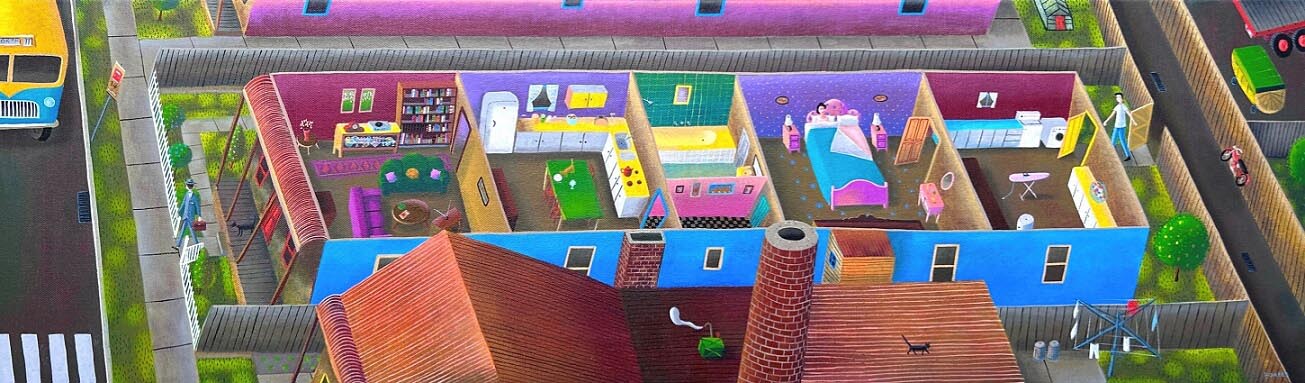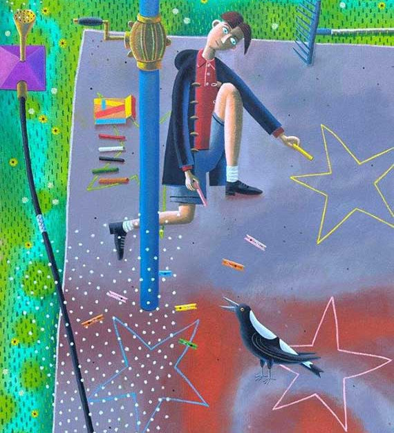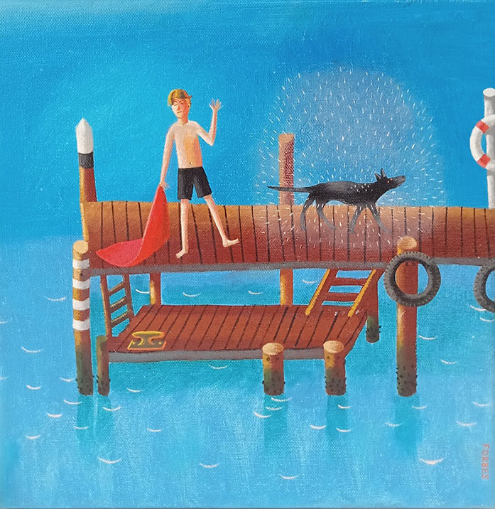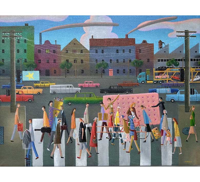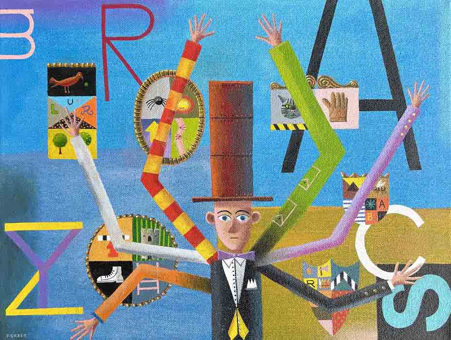 Rodney Forbes is is fascinated by how people tell stories. His vibrantĀ paintings address deeply poignant subject matter through dreamlike and surreal imagery. Figures and objects float against his trademark palette of bright, luminous colours, drawing the viewer in to explore a rich narrative. Drawing on both autobiographical and historical events, Forbes has the masterful ability to portray sometimes dark andĀ challenging subject matter through vibrant, cartoon-like imagery, resulting in deeply engaging works that invite extended contemplation.