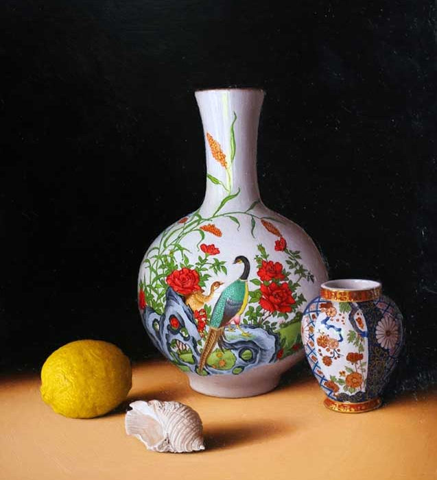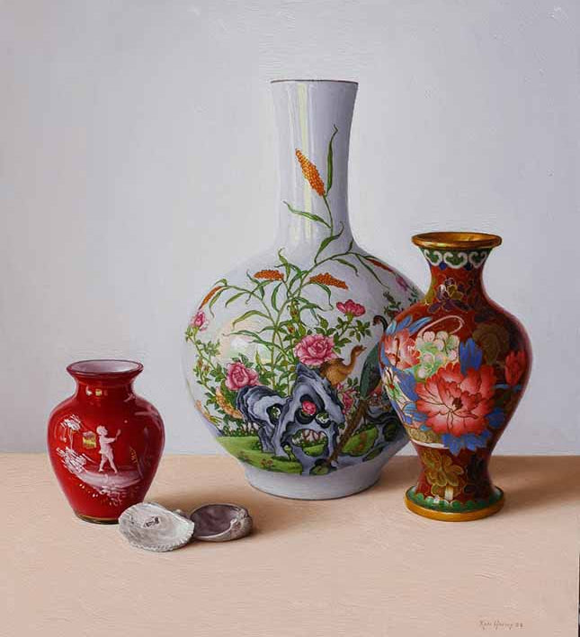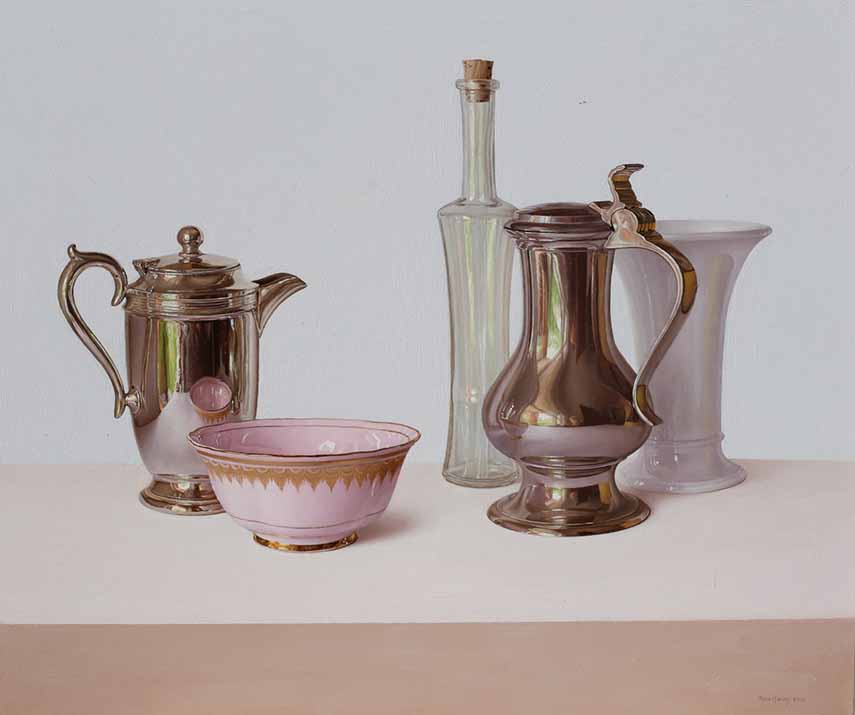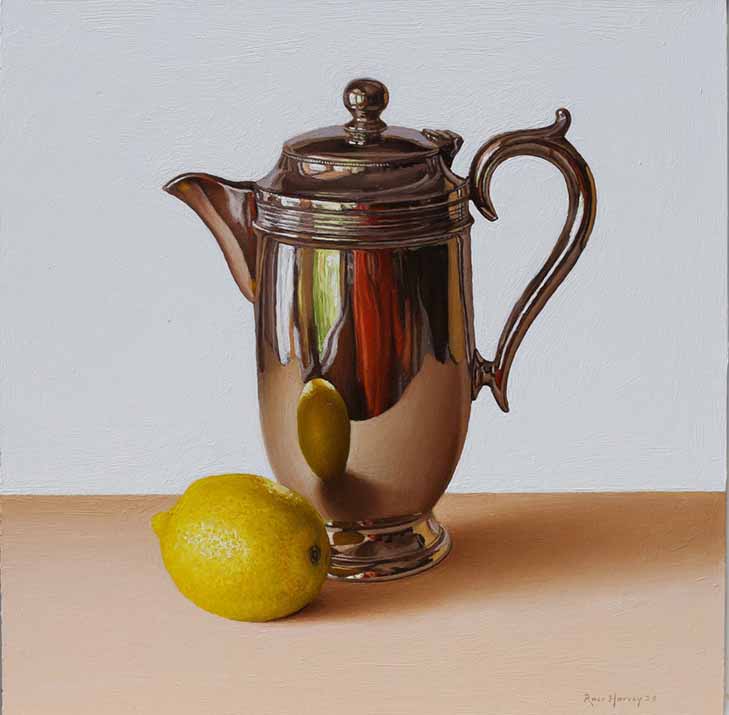 Harvey’s work combines classical elements of painting such as careful drawing, solid forms, constructed depth and planned composition, with the patient exploration of the secret life of things. Being quite short-sighted, he is used to examining things closely and in great detail, still life enables him to express this in painting. While Harvey spends his life in the pursuit of beauty and excellence, his vision of a perfect picture has evolved as he matured as an artist.