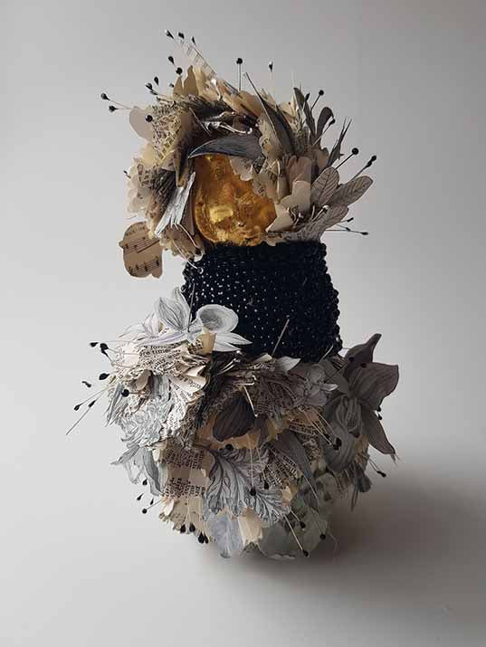 ceramic figurine, glass bead necklace, glass head pins, black and white