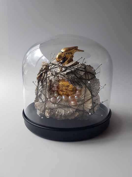 doll figurine, ceramic bird, pleated book papers, gold leaf, dyed fres