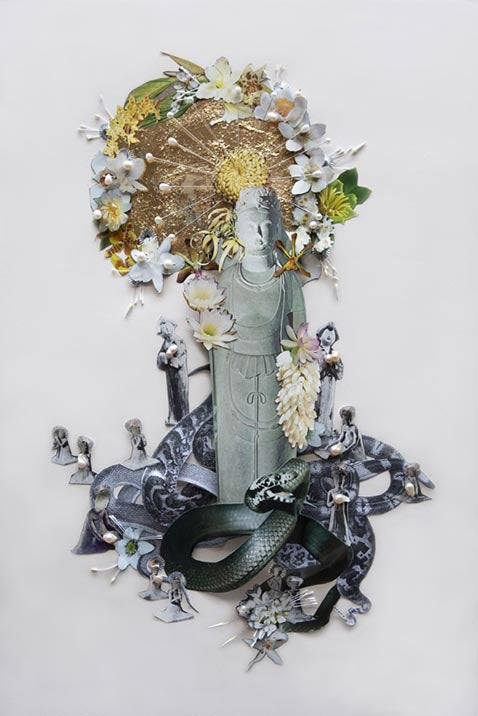 paper, glue, pearl head pins, gold leaf and faux stamens