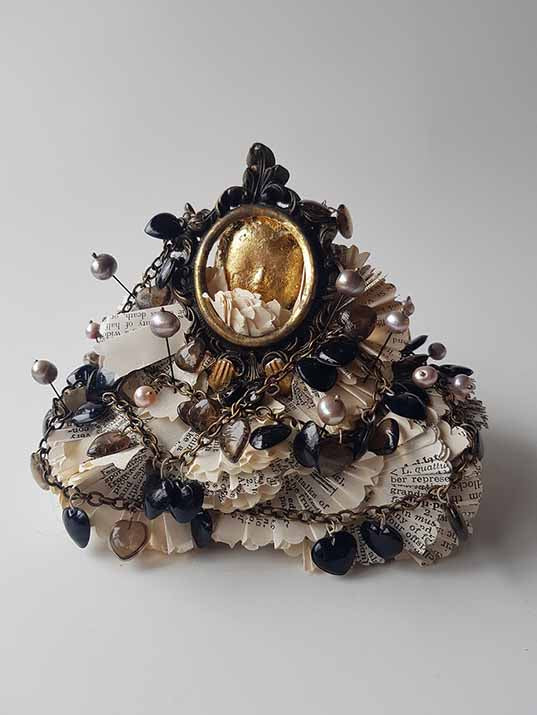 figurine, pleated book paper, resin frame, gold leaf, dyed fresh water