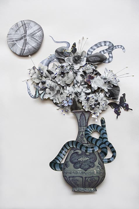 paper, glue, pearl head pins, gold leaf and faux stamens