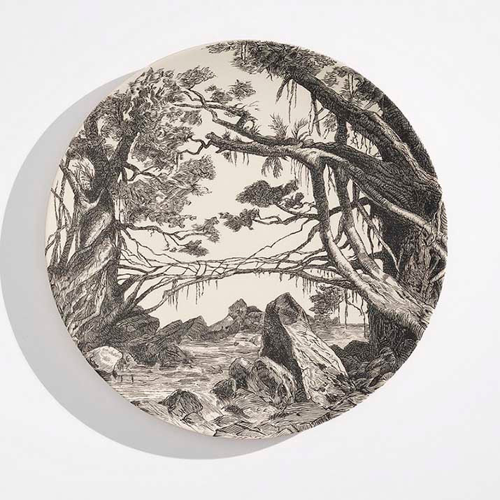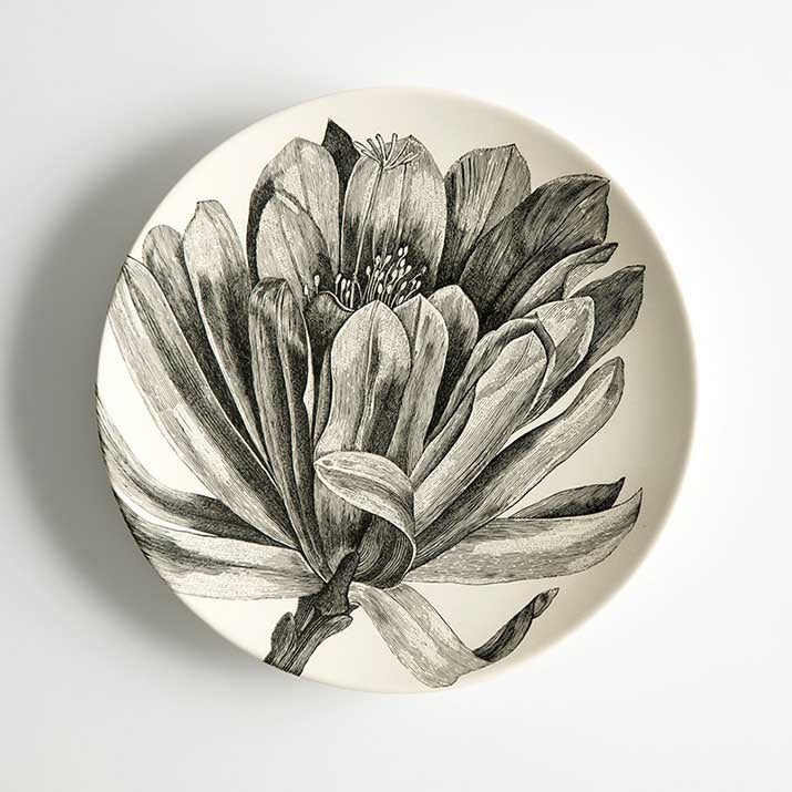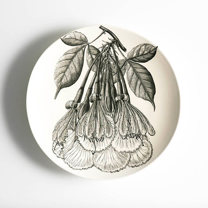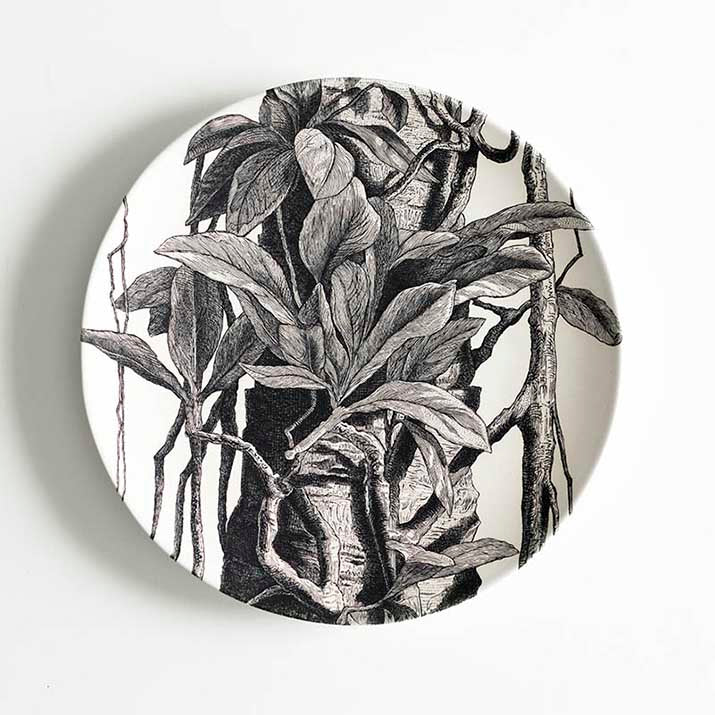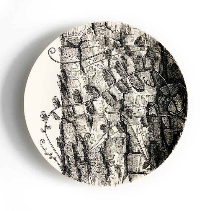 My inspiration lies in 19th-century scientific illustrations – those early attempts to record and understand the natural world. I spend time searching for imagery that resonates. Birds, spiders, vipers, eagles, butterflies, flowers and trees have all found their way into my work. These elements are not simply copied, but reinterpreted, rescaled, repositioned, and recombined to create something new. The plate becomes a portal into a reimagined natural world.