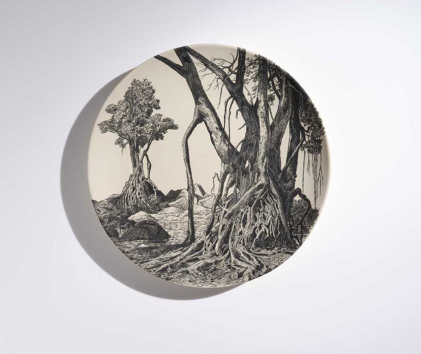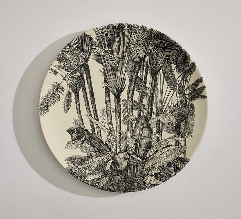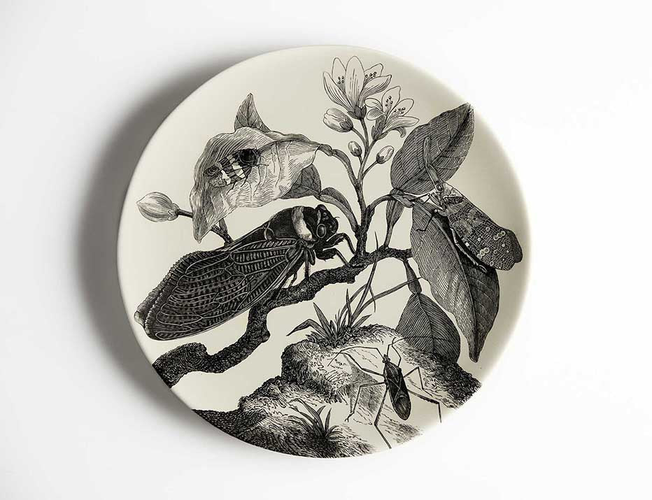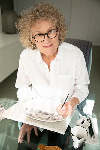 I work with the image in terms of size and placement, and then begins the slow and meditative practice of putting paint to porcelain. I obsess about how fine a line I can do; ultimately, I love seeing all the little black lines that I’ve painted come together to create an image.’… “