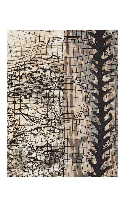 drypoint, pulp painting and earth pigments on handmade papers with stitching