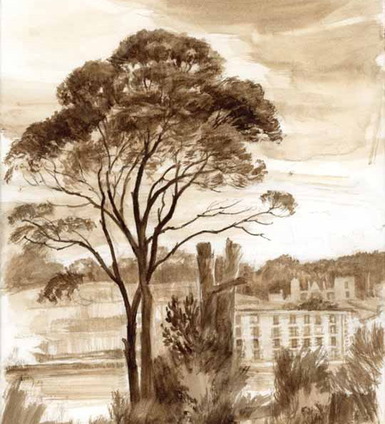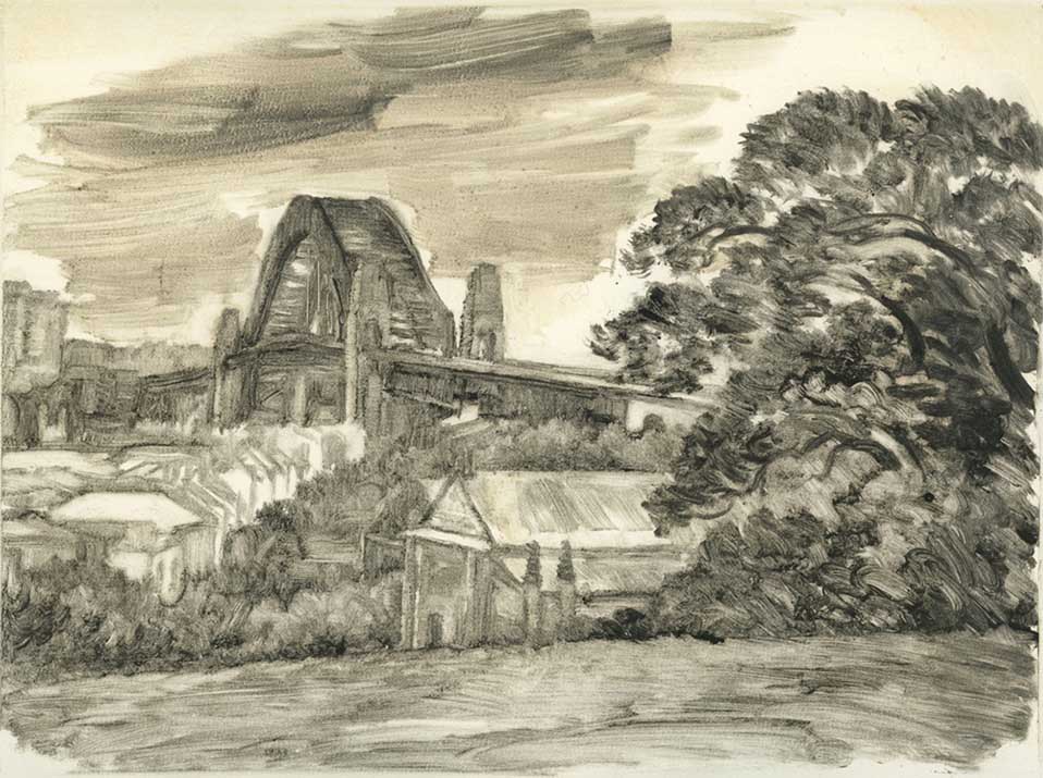 This exhibition brings together Jonathan’s etchings, beautifully restored and editioned by the master printer Monique Auricchio, and a selection of my own works with an emphasis on drawings but also monotypes, watercolours and oil paintings, including some previously unseen early existential cityscapes. Recent works trace an evolution towards a contemporary interpretation of the sublime and the pastorale, from a waterfall amidst remnant rainforest in suburban Sydney to a moon rising in a local park, a gorge in Tasmania or the ruins of Rome.