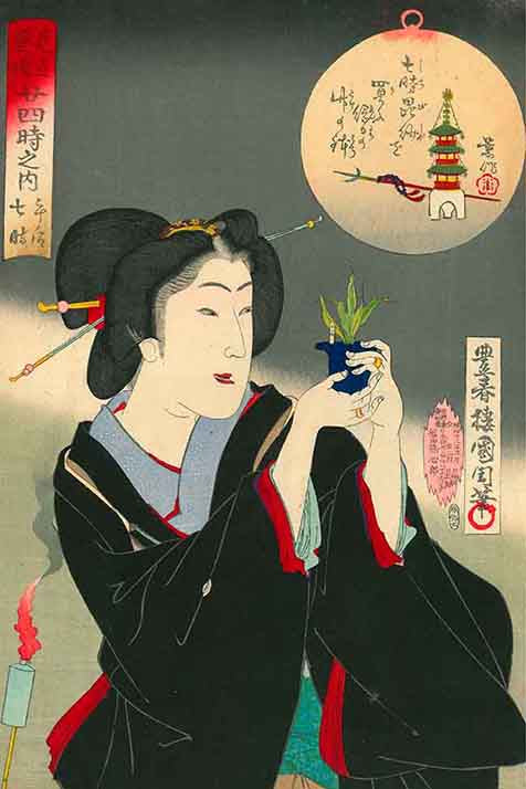 TOYOHARA KUNICHIKA (1835 – 1900) From the series, Scenes of the twenty four hours parodied (Mitate choya nijuyoyi no uchi). Bishamonten Fair at 7pm 1891