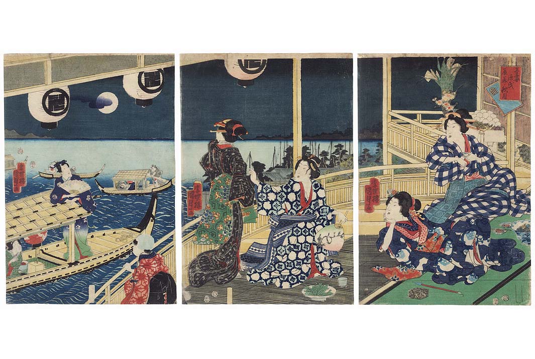 UTAGAWA KUNISADA II (1823 – 1880) Eastern Genji and the Autumn Moon at Fukagawa from the Tales of Genji, the young prince arrives by boat for a moon viewing party 1856